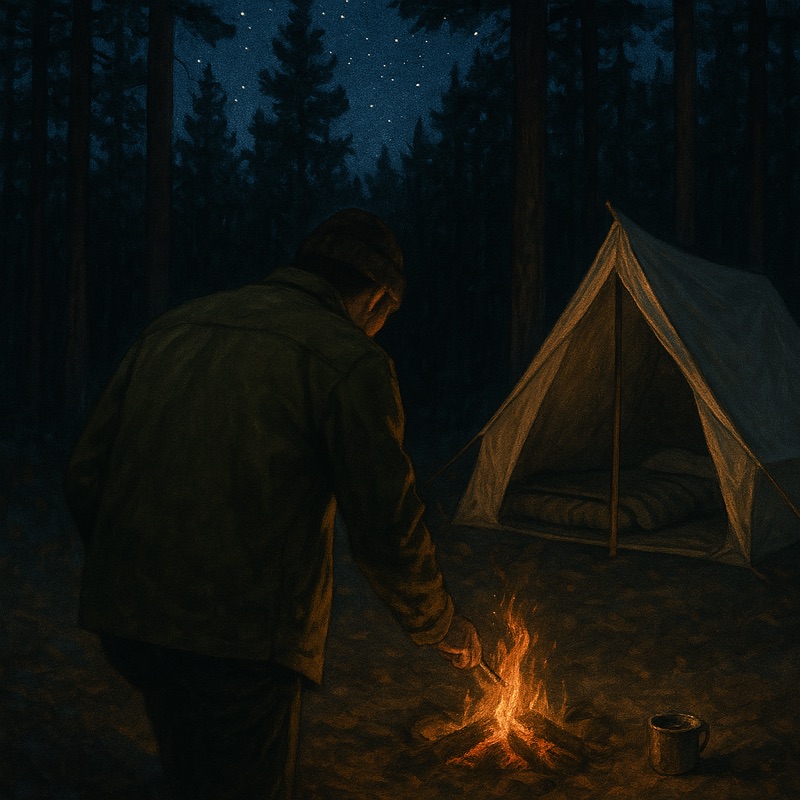 The tent was small, canvas, and smelled of old smoke and dry grass. He laid out the bedroll, creased from years of folding. Pulled the wool blanket over it, tested the zipper on the flap. The stars were brighter now, sharp and cold. He poured the last of the whiskey into his cup, sipped it while the air wrapped around him like a second coat. Owls called somewhere out in the trees, distant and low, like voices in a dream.