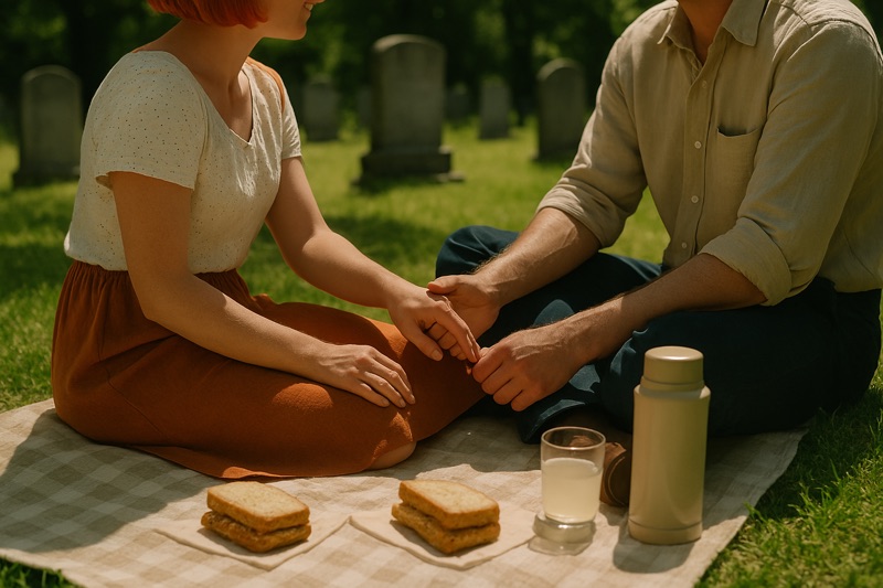 The sun was high and clean, the kind that bleaches the stones and warms the skin without apology. They sat on a folded blanket between two worn markers—“Beloved Wife, 1887–1932” and “Infant Son, 1904.” She unwrapped sandwiches from wax paper, and he poured lemonade from a thermos, the ice inside clinking like wind chimes. They ate in silence for a while, the kind of silence that comes from long knowing. Old friends, yes. But something had changed. The nearness of her hand to his. The way he watched her brush crumbs from her lap.